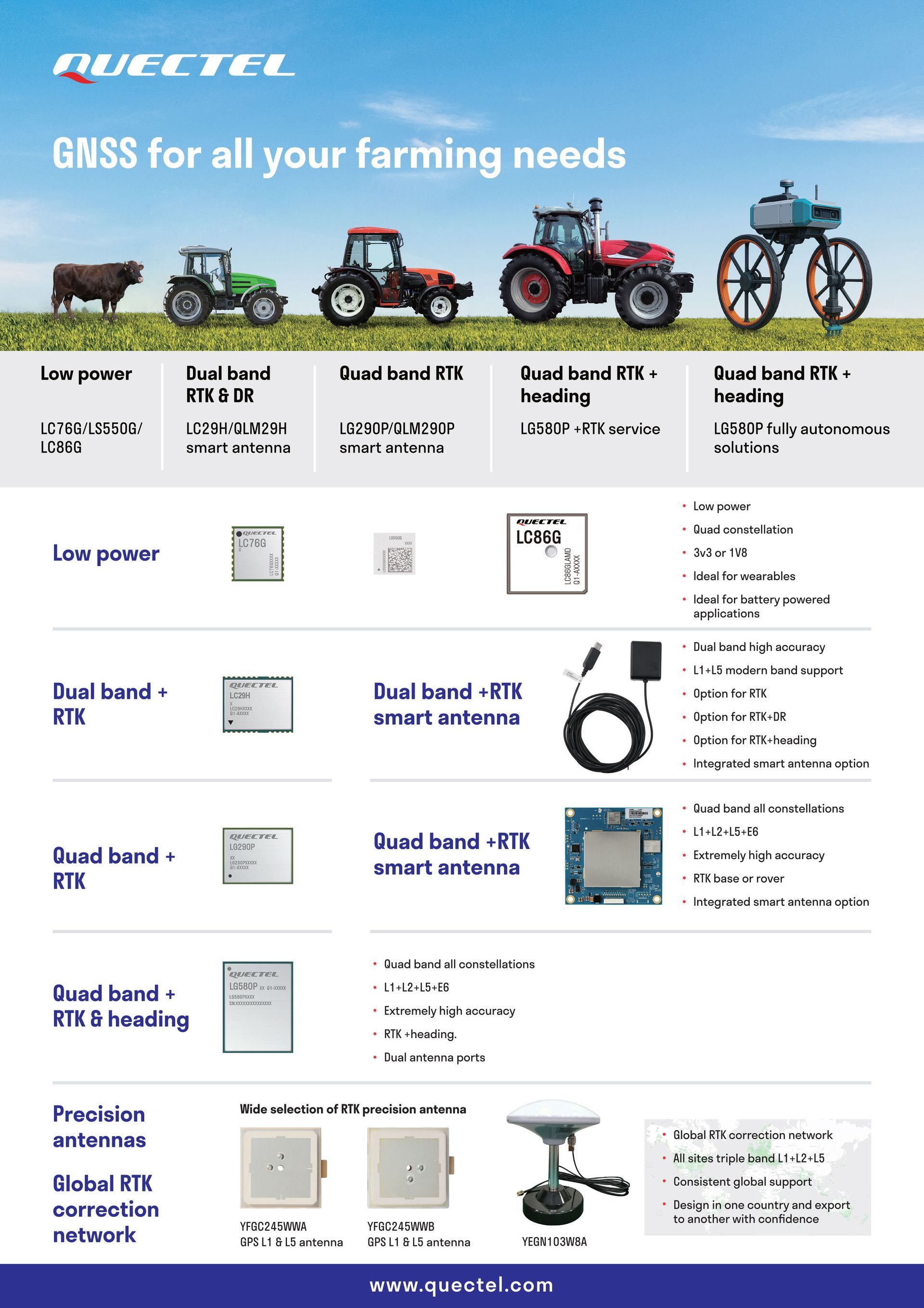 Quectel’s comprehensive range of modules has been designed to support precision agriculture applications. The Quectel LC29H series offers compact, low-power dual-band modules with RTK and dead reckoning (DR). The series supports constellations including GPS, Galileo, BeiDou, GLONASS, QZSS and NavIC using modern L1 and L5 frequency bands to deliver centimetre-level accuracy even in tough conditions.
