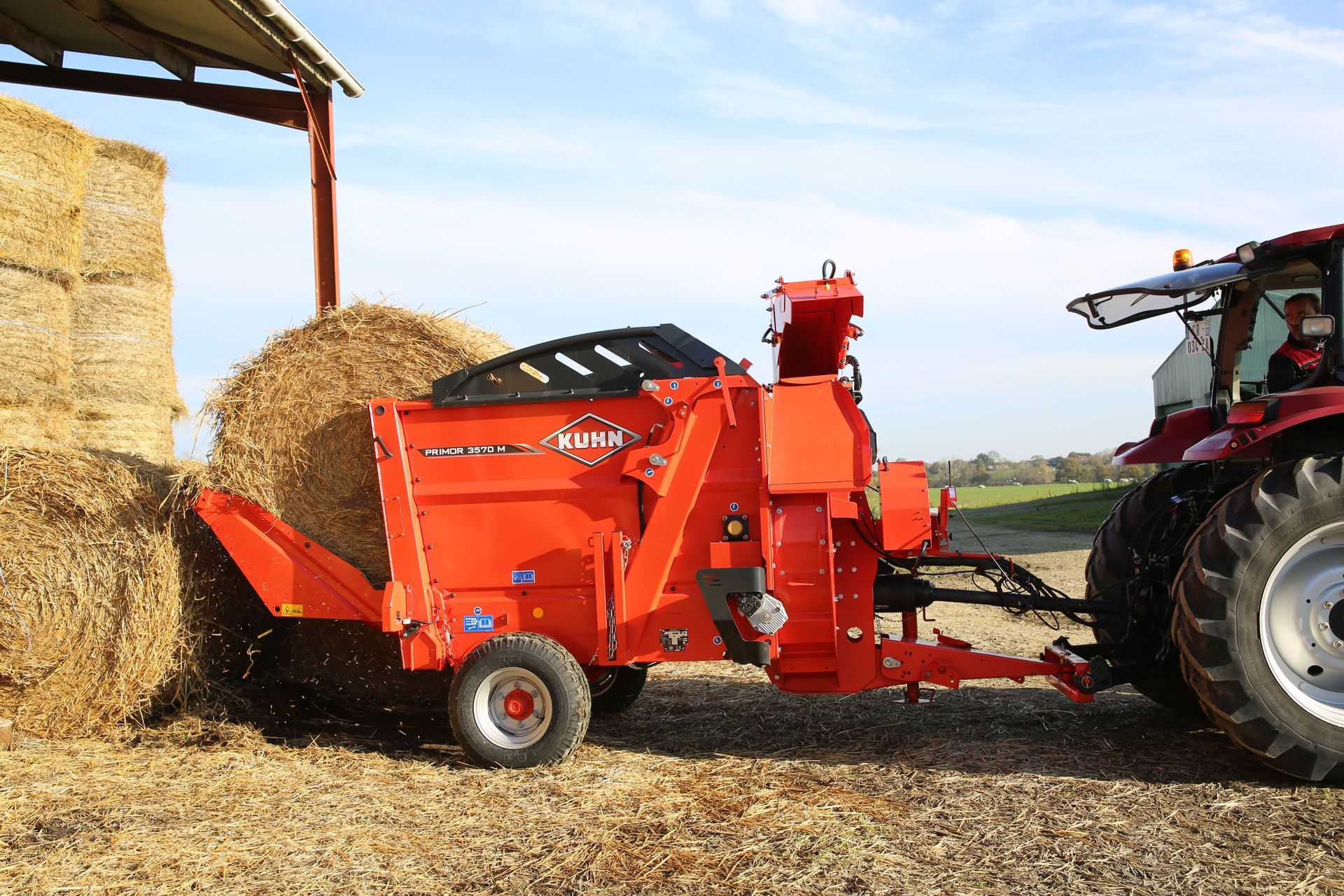 Tom De Greenlaw is KUHN Australia’s specialist mixer and an expert on the Primor machines. He says the Primor 5570M can hold up to three round bales or one large square bale; however, in Australia, KUHN sell an additional range of capacities: 2 cubic metres trailed; 3.5 cubic metres trailed; 4.2 cubic metres trailed; and 15 cubic metres trailed (which can hold up to 3 large round bales or four large square bales).